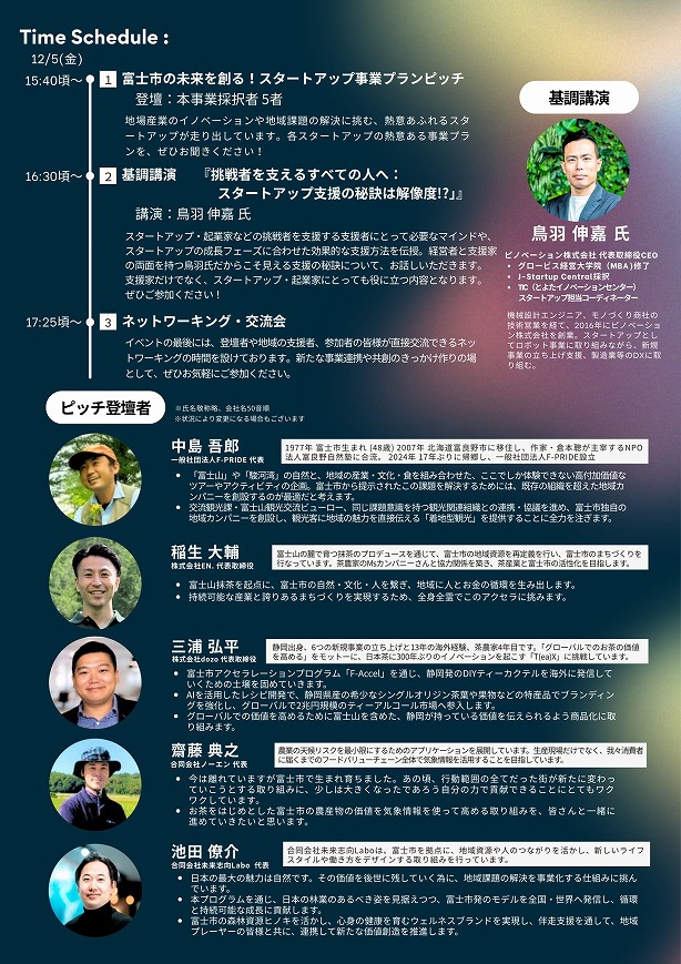 12月5日(金)にスタートアップ5者による事業プラン発表、新規事業創出の専門家による基調講演、交流会を行う「スタートアップミートアップイベント」を開催します。本イベントは、富士市の未来を担うスタートアップの事業に触れ、支援者や地域の事業者の皆様が直接繋がり、新たな共創を生み出すための場となっております。富士市の未来を共に創る方々との出会いに、ぜひご参加ください。