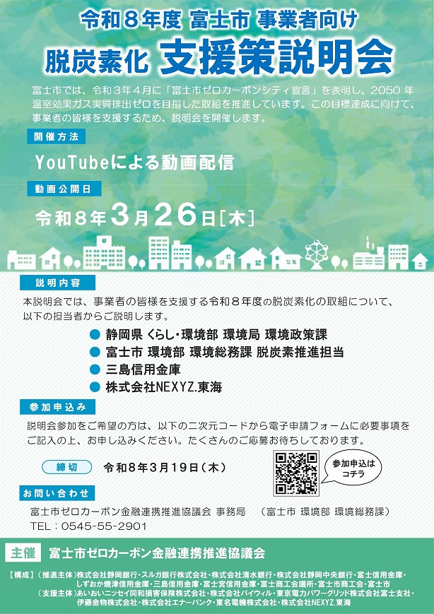 富士市ゼロカーボン金融連携推進協議会の取組として「令和8年度事業者向け脱炭素化支援策説明会」を開催しますので、お知らせいたします。概要につきましては、チラシのとおりです。datusansosetumei